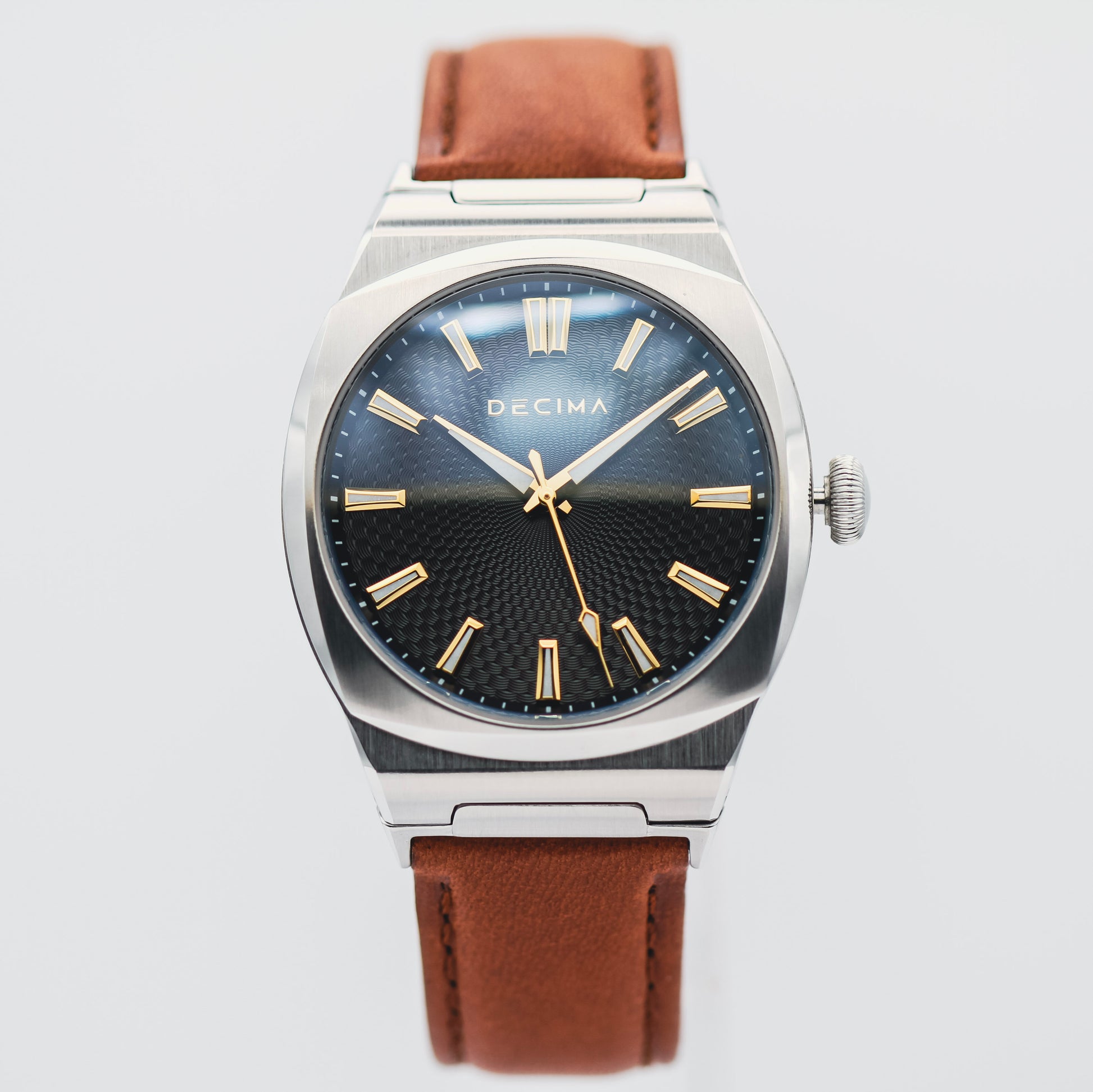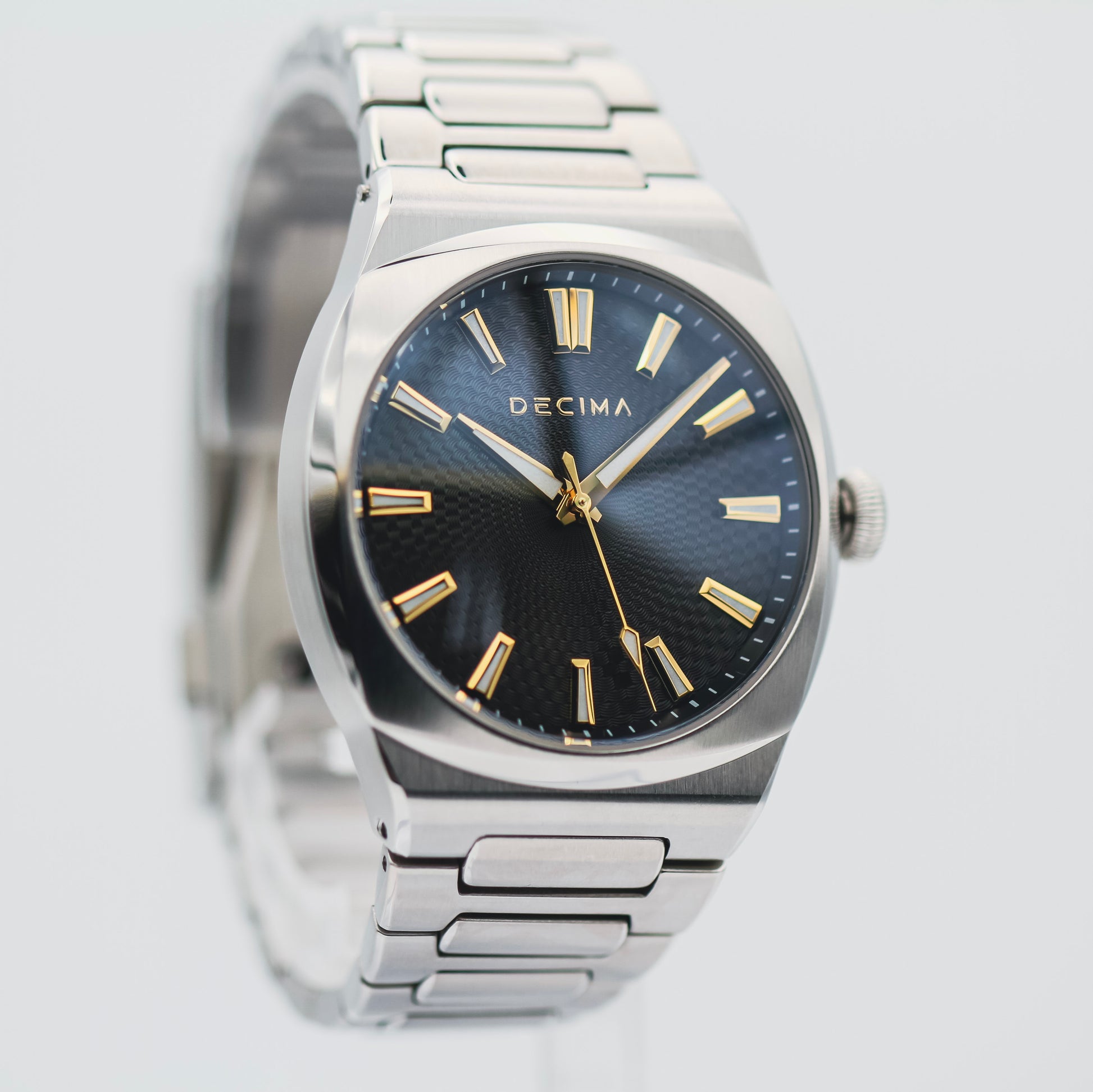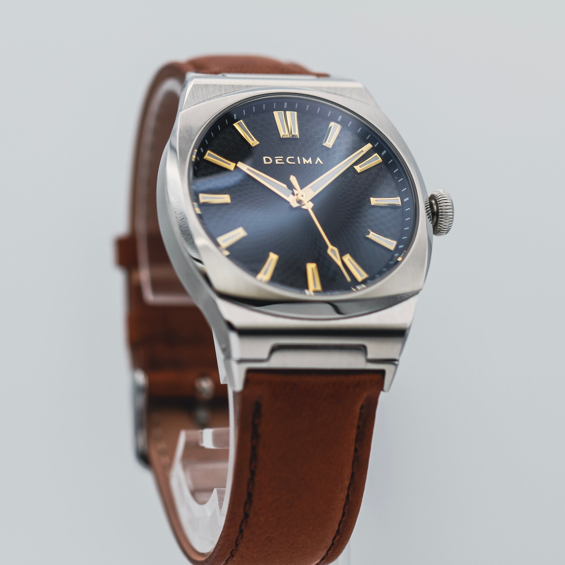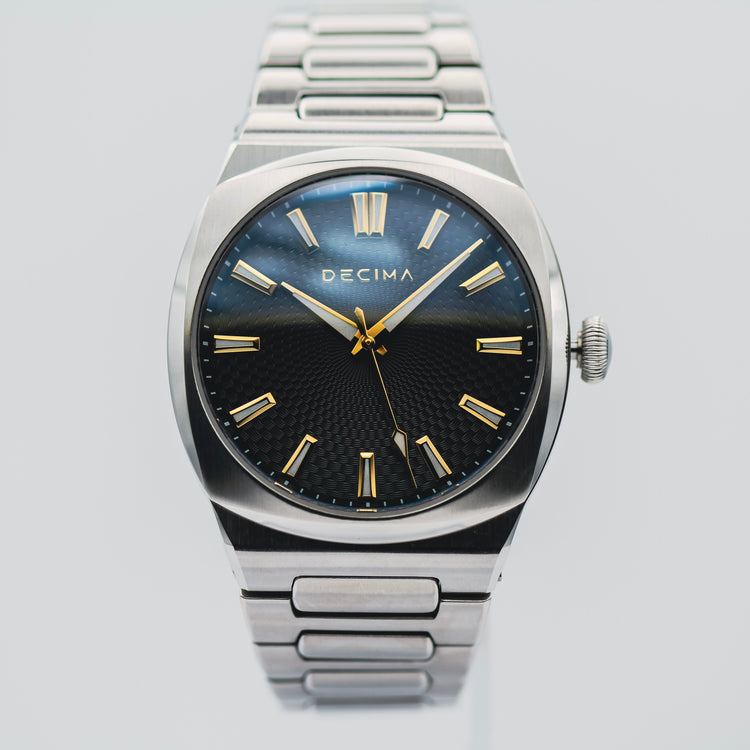 The Decima Gatekeeper Collection seamlessly blends two distinct worlds of watchmaking. Its classic dial showcases elegant dauphine hands, multifaceted applied indices, and a guilloché panier pattern, while the bold, modern case stands out with its unique shape and a mix of brushed and mirror-polished finishes. The Gatekeeper boldly demonstrates that combining contrasting styles in a single timepiece creates a striking, standout statement.
