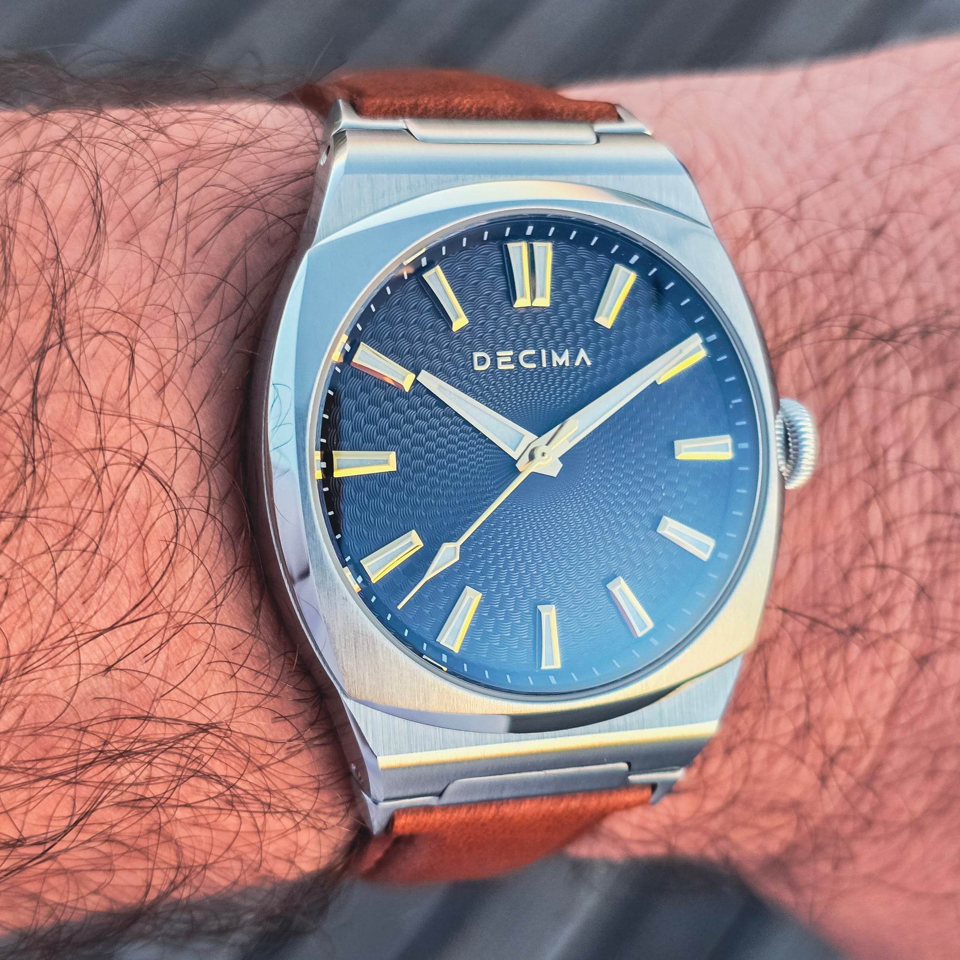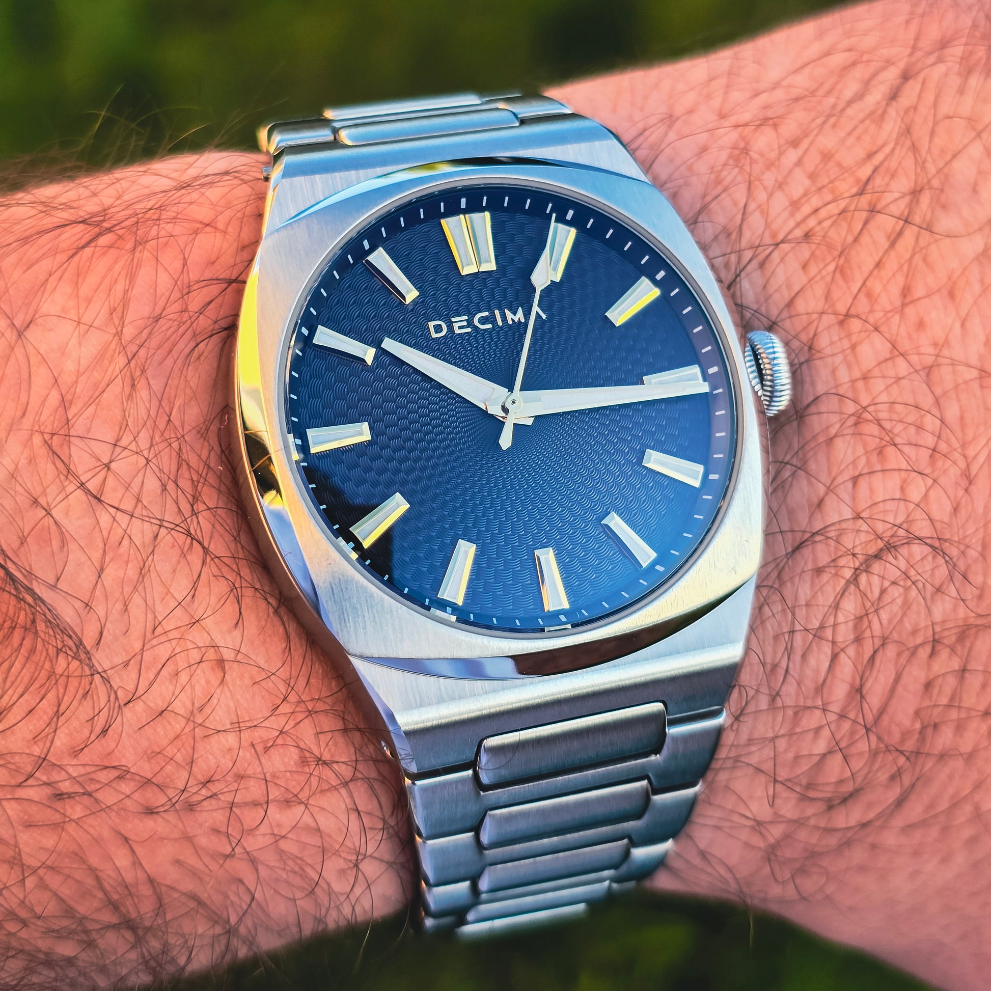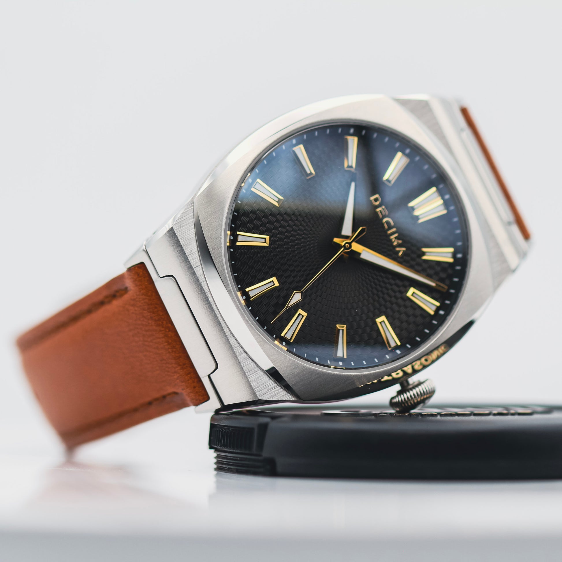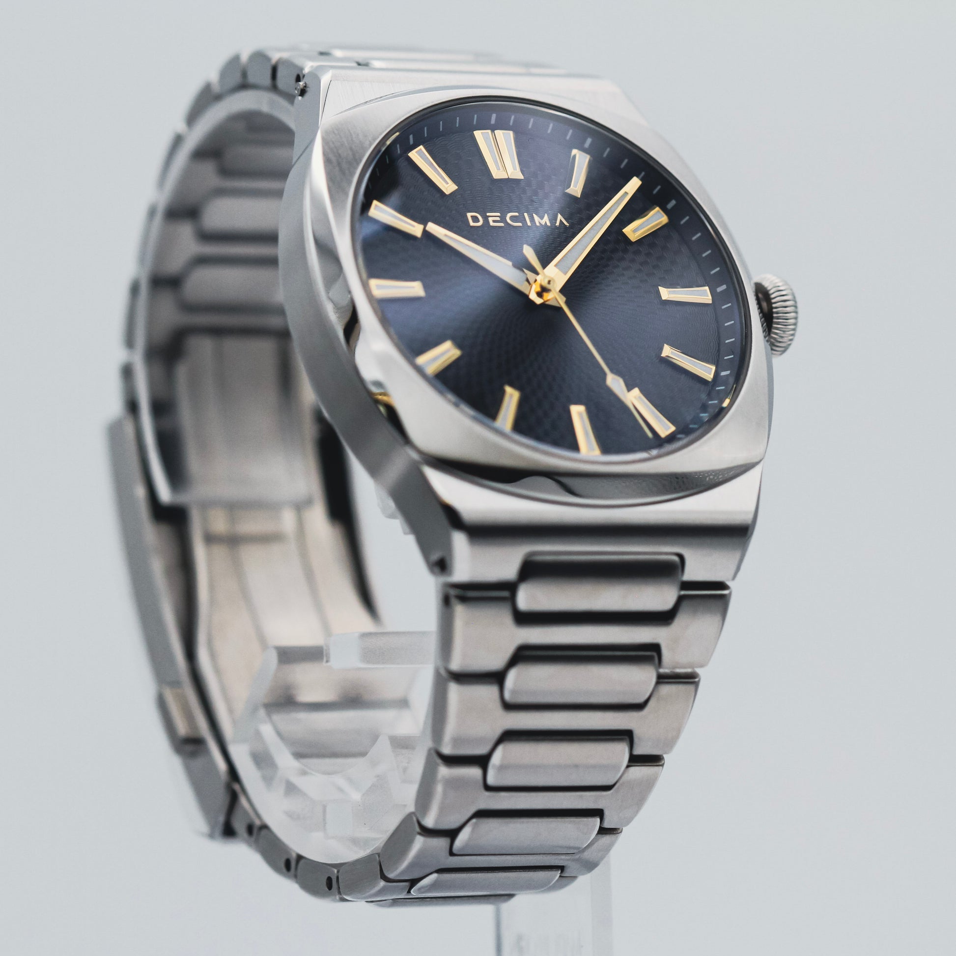 The Decima Gatekeeper Collection seamlessly blends two distinct worlds of watchmaking. Its classic dial showcases elegant dauphine hands, multifaceted applied indices, and a guilloché panier pattern, while the bold, modern case stands out with its unique shape and a mix of brushed and mirror-polished finishes. The Gatekeeper boldly demonstrates that combining contrasting styles in a single timepiece creates a striking, standout statement.