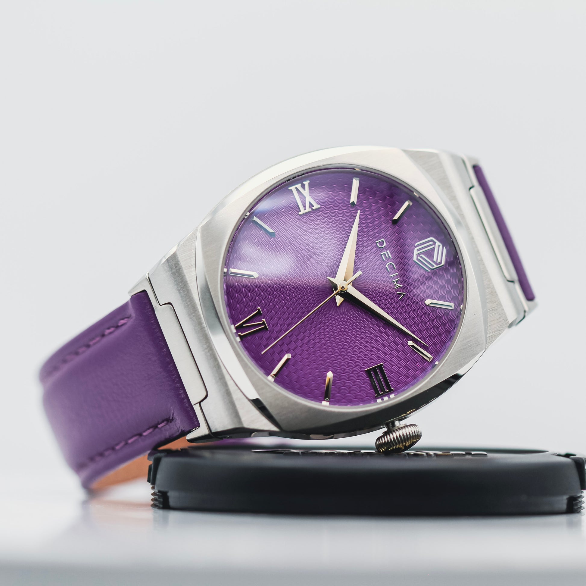 The Decima Gatekeeper Collection seamlessly blends two distinct worlds of watchmaking. Its classic dial showcases elegant dauphine hands, Roman numerals, and a guilloché panier pattern, while the bold, modern case stands out with its unique shape and a mix of brushed and mirror-polished finishes. The Gatekeeper boldly demonstrates that combining contrasting styles in a single timepiece creates a striking, standout statement.