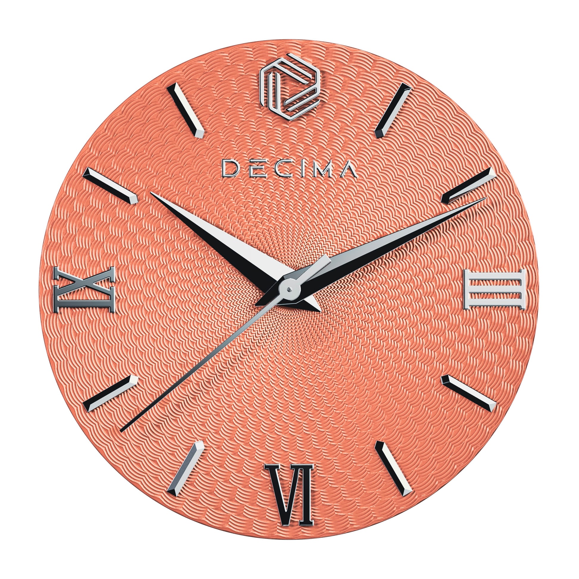 The Gatekeeper showcases a unique blend of applied custom-made, mirror-polished Roman numerals and chamfered, faceted indices. Roman numerals are displayed at the 3, 6, and 9 o'clock positions, while the Decima logo is distinctively placed at the 12-hour position.